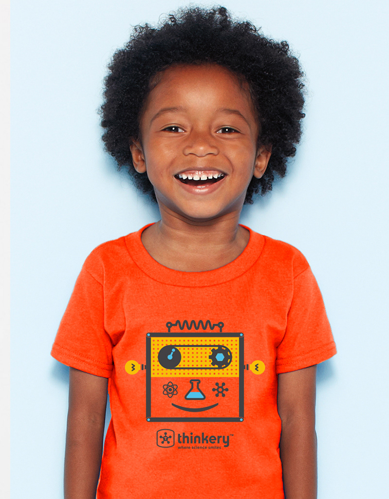 The Thinkery is Austin's non-traditional children's museum, catering to learners of all ages using the STEAM educational philosophy. The first T-shirt plays on the museum's slogan, "Where Science Smiles," and shows a smiling face made up of shapes from their signature Simple Machines exhibit. The second T-shirt depicts a pig, the Thinkery's official mascot. The third T-shirt features the Light Lab, a life-size Lite Brite exhibit.